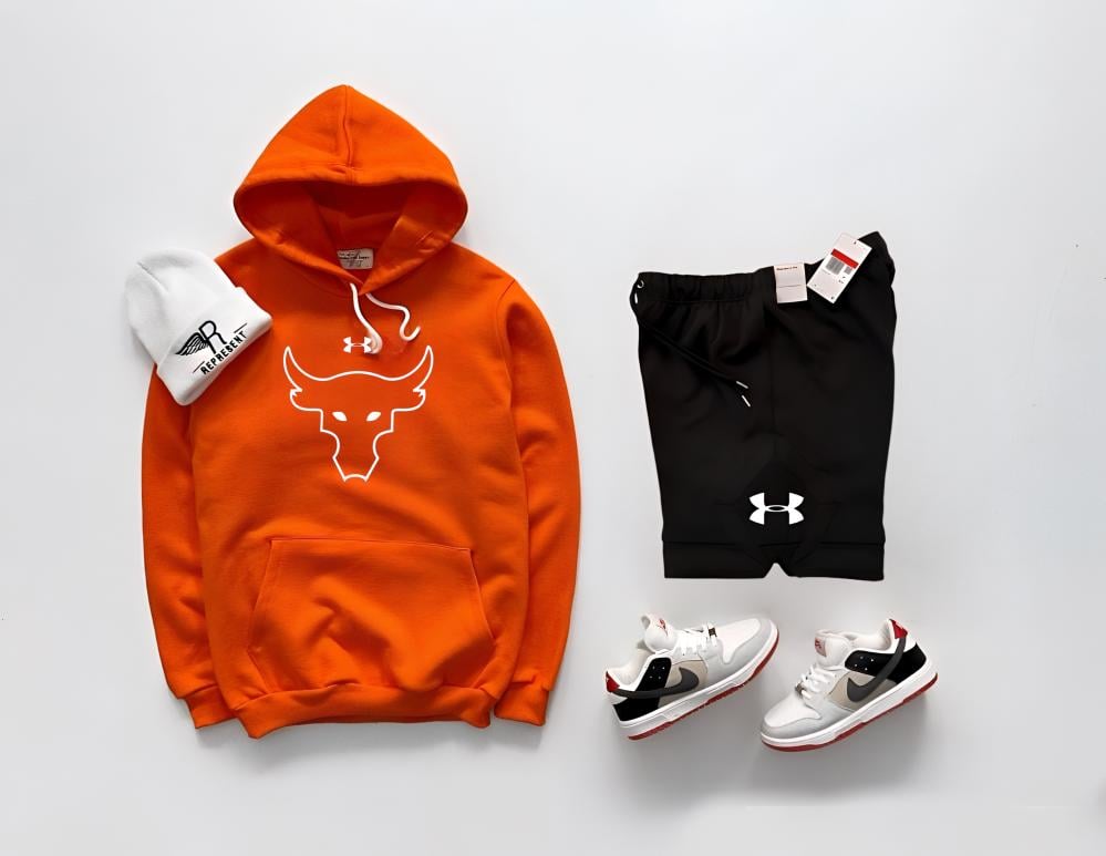 - ميّز بإطلالة رياضية جريئة مع هذا الطقم العصري الذي يجمع بين هودي برتقالي وشورت أسود. يأتي الهودي بتصميم مريح وخامة دافئة، مما يجعله مثالياً للأيام الباردة أو للإطلالات الكاجوال. الشورت الأسود مصمم من مواد عالية الجودة، ليمنحك الراحة والمرونة أثناء التمارين أو الاسترخاء. إضافة إلى ذلك، يُكمل الحذاء الرياضي الأبيض المظهر العام للطقم، مما يجعله اختياراً مميزاً للأناقة والراحة في آنٍ واحد